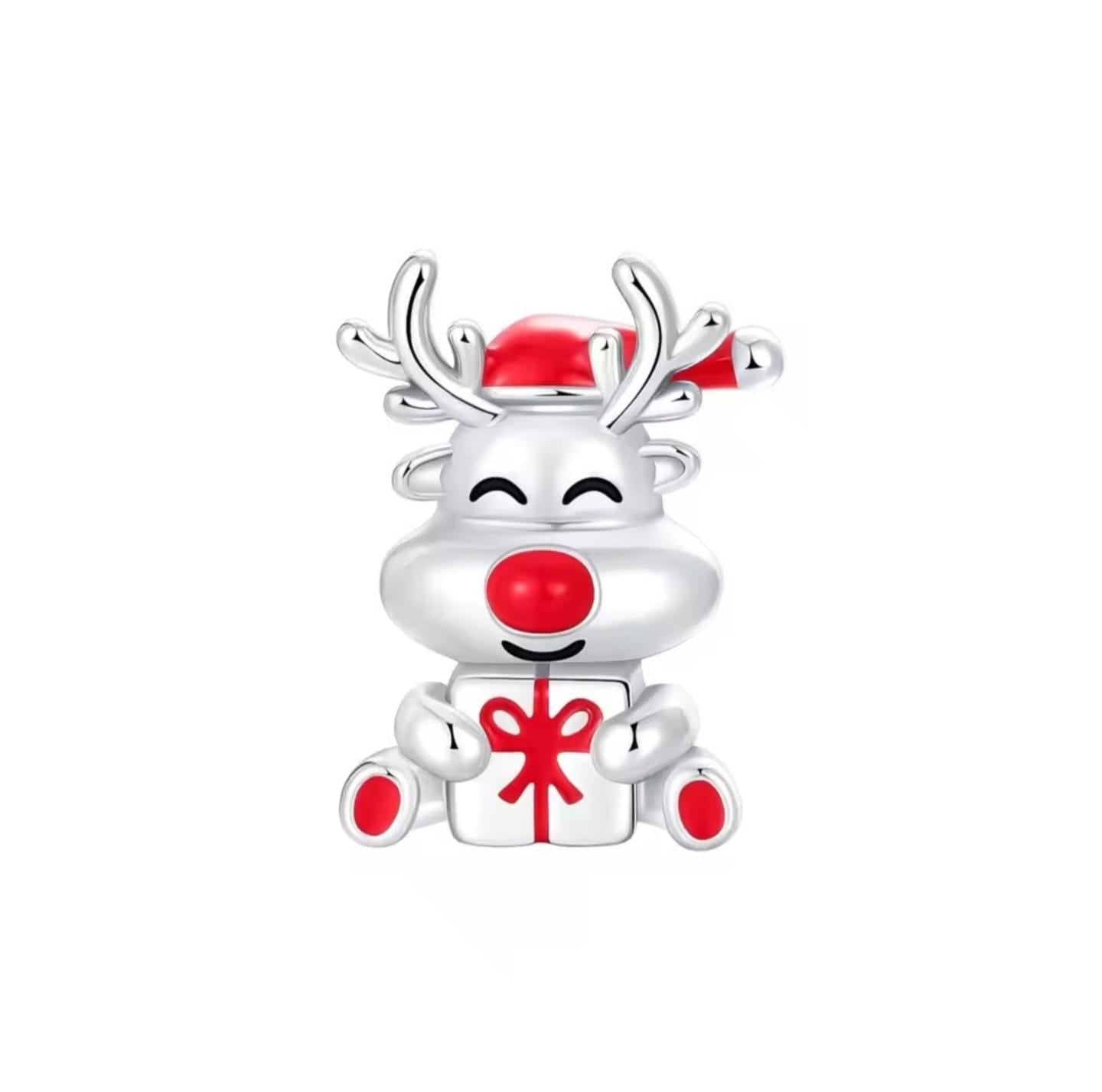 Este charm colgante presenta la figura noble del reno, con sus astas orgullosas y detalladas como el punto focal. El diseño es elegante y estilizado, capturando al reno en pleno movimiento. La plata está pulida a un alto brillo, reflejando las luces de la temporada
